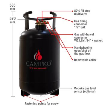 Sylindrisk LPG-tank (propan/butan) for oppvarming, komfyr og kjøleskap i bobil, campingvogn og food truck.